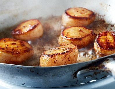 - Faire mariner les pétoncles 2 minutes dans le reste de la sauce. Répartir la julienne de mangue dans 4 cercles métalliques de 10 cm de diamètre x 5 cm de hauteur (4 po x 2 po)* chacun, déposés sur 4 assiettes de service. Couronner chaque portion de julienne de tranches de pétoncles se chevauchant.