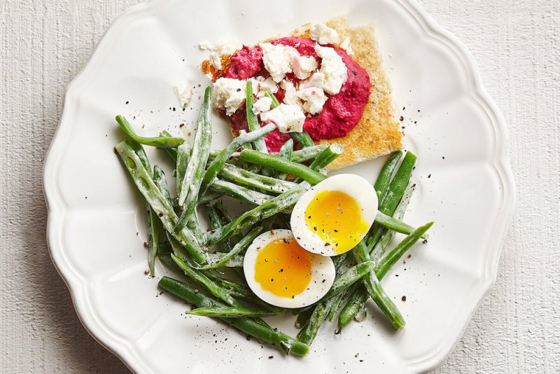 ŒUFS MOLLETS ET HARICOTS, TARTINE D'HUMMUS AUX BETTERAVES
